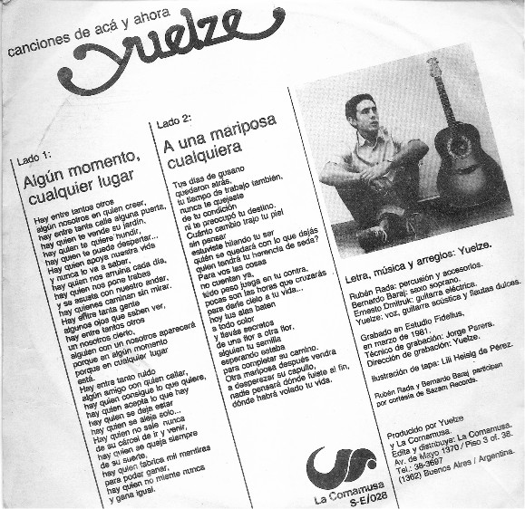 Disco simple en vinilo. año 1981, grabado en el sello La Cornamusa, con Rubén Rada en percusión y accesorios,